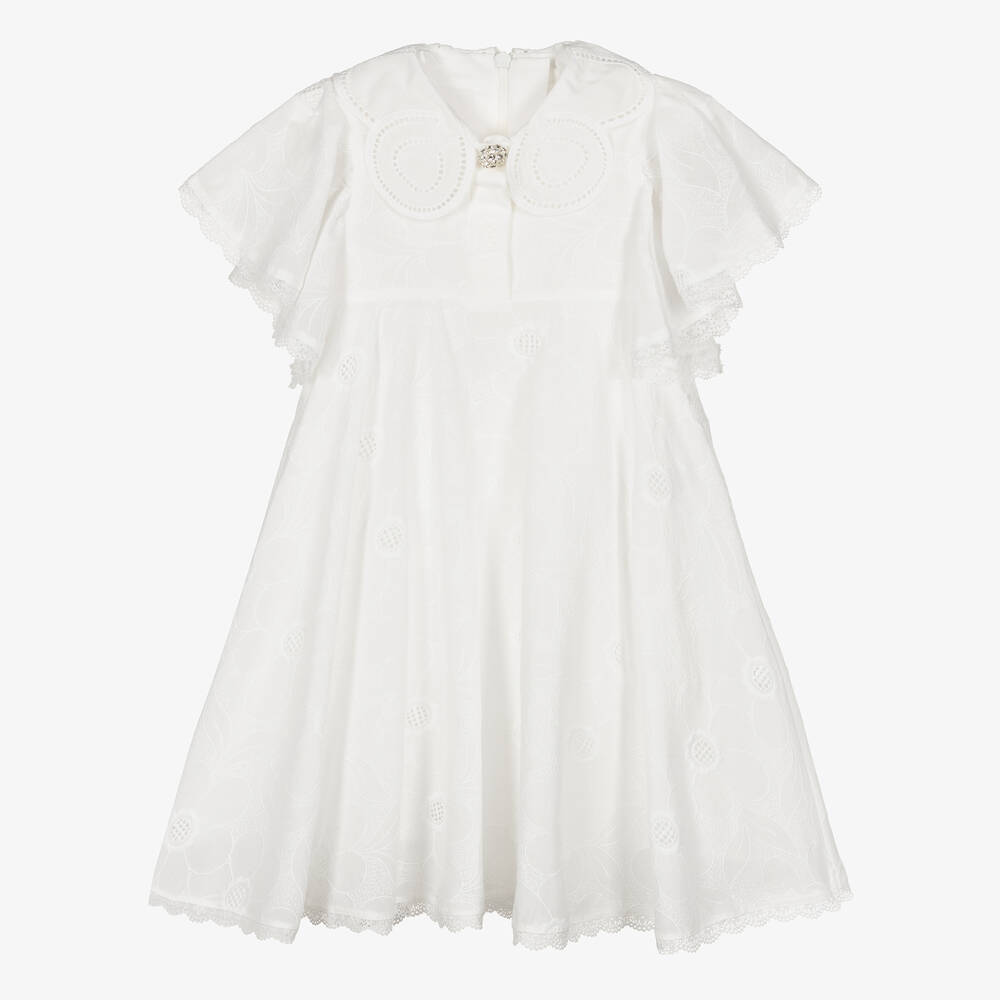 Beautiful off-white dress by Junona, an online exclusive to Childrensalon. With a gorgeous embroidered overlay, trimmed with lace details and delicate cutwork, this A-line design has a lightweight, floaty shape, with flutter sleeves. There is a feature collar, decorated with a sparkly button in the centre and concealed buttons on the bodice. It is fully lined in soft voile for comfort and has a concealed zip fastening on the back.