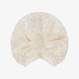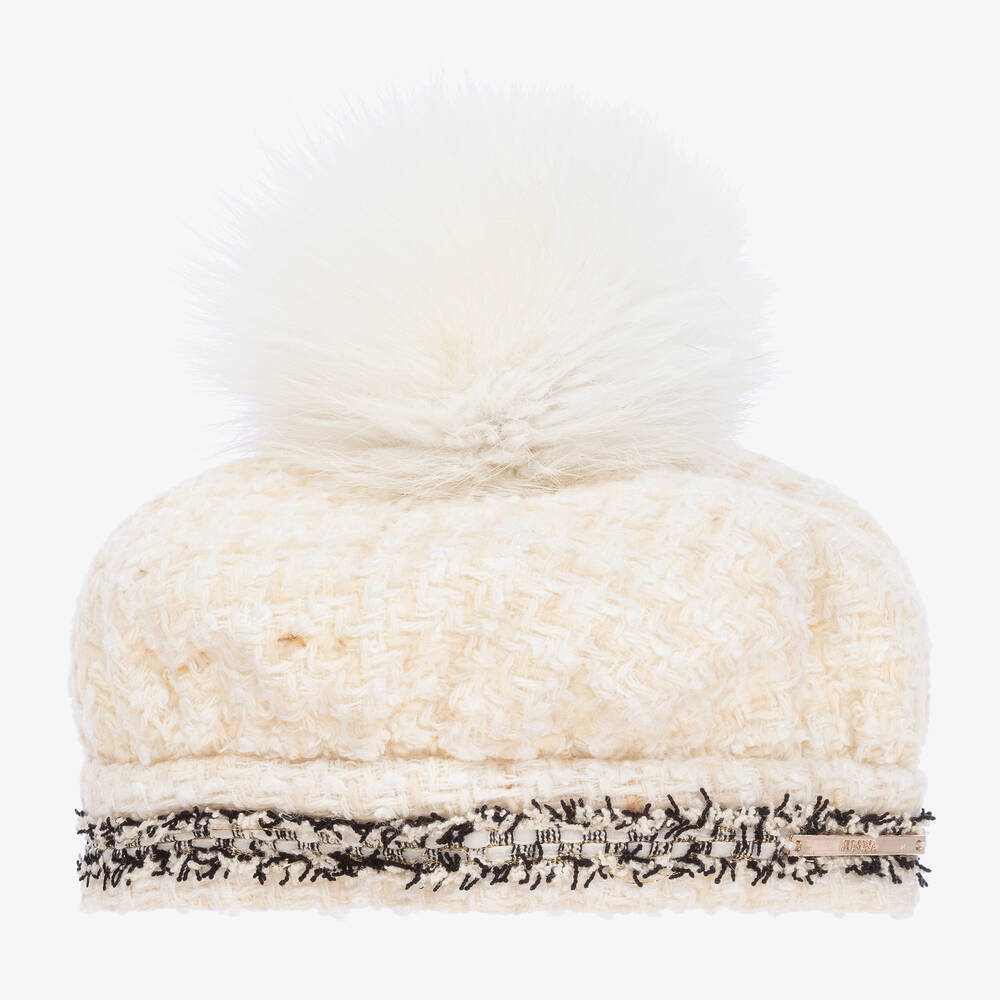 Stylish ivory tweed beret for girls by Junona, made in a soft wool and cotton blend with a fur pom-pom on the top. It has textured trim around the brim with black and sparkly gold thread for a lovely contrast. The designer's gold metal logo plate is stitched on one side and the hat is gently elasticated around the back for comfortable wear.