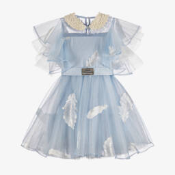 Gorgeous navy blue dress for girls by Junona, made in a soft chiffon with layers of soft tulle for added volume. This stunning dress has a shimmering foil effect floral print and an oversized white lace collar with pretty diamanté detailing. It has balloon sleeves with ruched detailing at the top and on the bodice and a fully gathered skirt with a frilled hem. Beautifully finished with a sparkling pink bow on the front, it fastens at the back with a concealed zip.