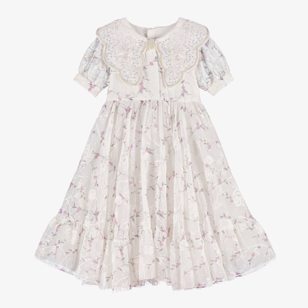 A beautiful white chiffon dress for older girls by Junona, both embroidered with white floral detail and printed with lilac purple flowers. Lovely for a special occasion, it has an eye-catching, oversized collar with gorgeous beading and sequin embellishment. It has short sheer sleeves and is layered with soft tulle to create an elegant, floaty shape.