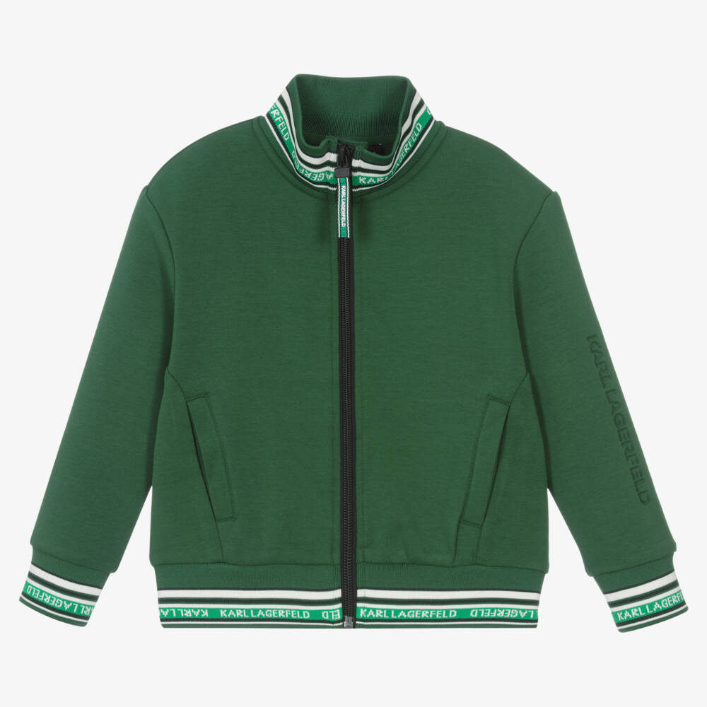 Sporty forest green zip-up top for boys by KARL LAGERFELD KIDS, with green and white jacquard logos on the striped, ribbed trims. There is an embossed logo on one sleeve for extra brand recognition. Great for layering, it is made in a comfortable cotton jersey blend, with useful front pockets. It fastens with a front zip that has a branded zip pull.