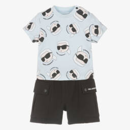 Sweet pink and white shorts set for little girls by KARL LAGERFELD KIDS. Made in soft cotton jersey, the T-shirt has the brand's iconic Choupette printed on the front with a gold foil 'KARL' logo. It fastens on the back with poppers. The shorts are made in soft textured jersey and have front pockets trimmed with white and glittery gold jacquard tape. They have an elasticated waist for a comfortable fit and simply pull on.