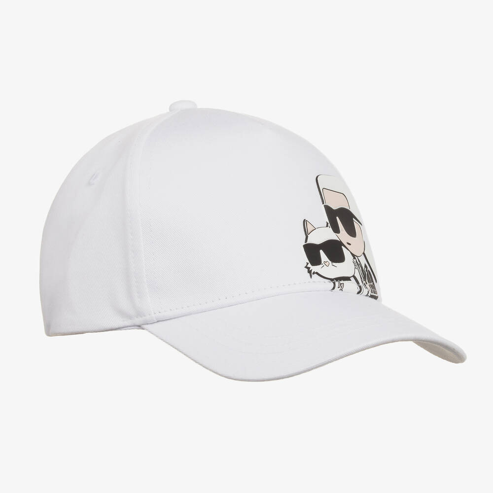 White cap for girls by KARL LAGERFELD KIDS, made in soft cotton twill. It has a cool, rubberised Karl Ikonik logo on the front with his beloved cat Choupette. There are more branded details on the side and back and an adjustable strap to ensure a great fit.