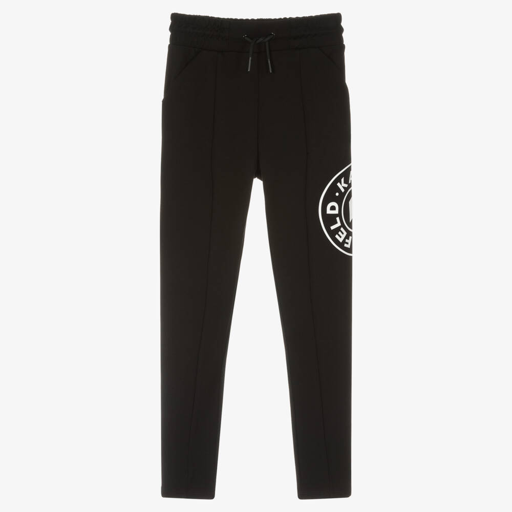 Stylish black joggers for teen girls by KARL LAGERFELD KIDS, with a white circular logo print on one leg. Inspired by the athleisure look, they have a gently elasticated drawstring waistband and pockets on the side. In a relaxed slim fitting look, they are made in smooth and comfortable viscose blend jersey.