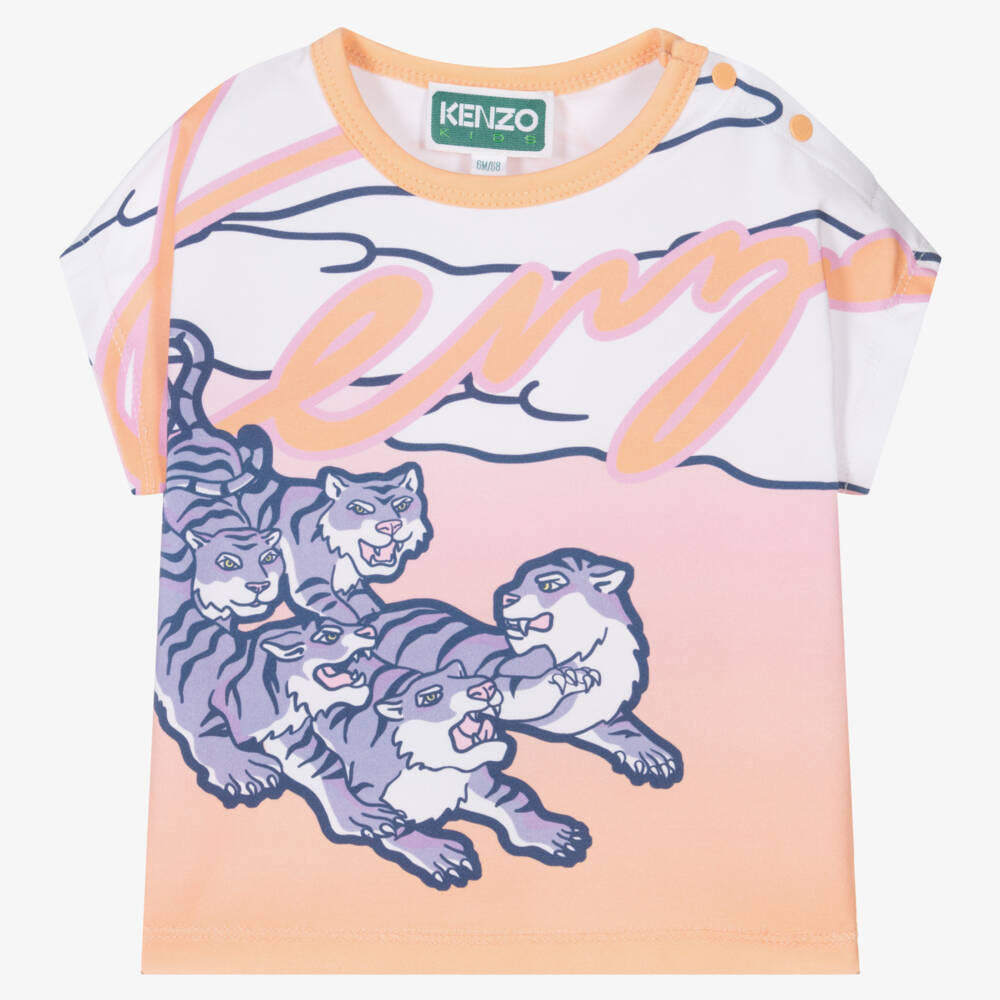 Pale orange and pink Multi-iconics T-shirt for baby girls from KENZO KIDS, made in soft cotton jersey. Taking cues from the brand's Asian heritage, it has Japanese style blue tiger prints on the front, with large orange logo lettering. The iconic Elephant can be found on the back, for another recognisable touch. It is finished with a pale orange-pink neckline trim and matching branded popper fastenings on one shoulder.