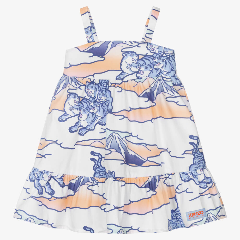 Baby girls white dress by KENZO KIDS, made in lightweight cotton poplin. The print draws inspiration from the brand's heritage through a Japanese mountain scene, with cool blue tigers. It has a gathered skirt and a stretchy ruched back for comfort and fit. There is an eye-catching pale blue and orange logo patch on the front near the hem.