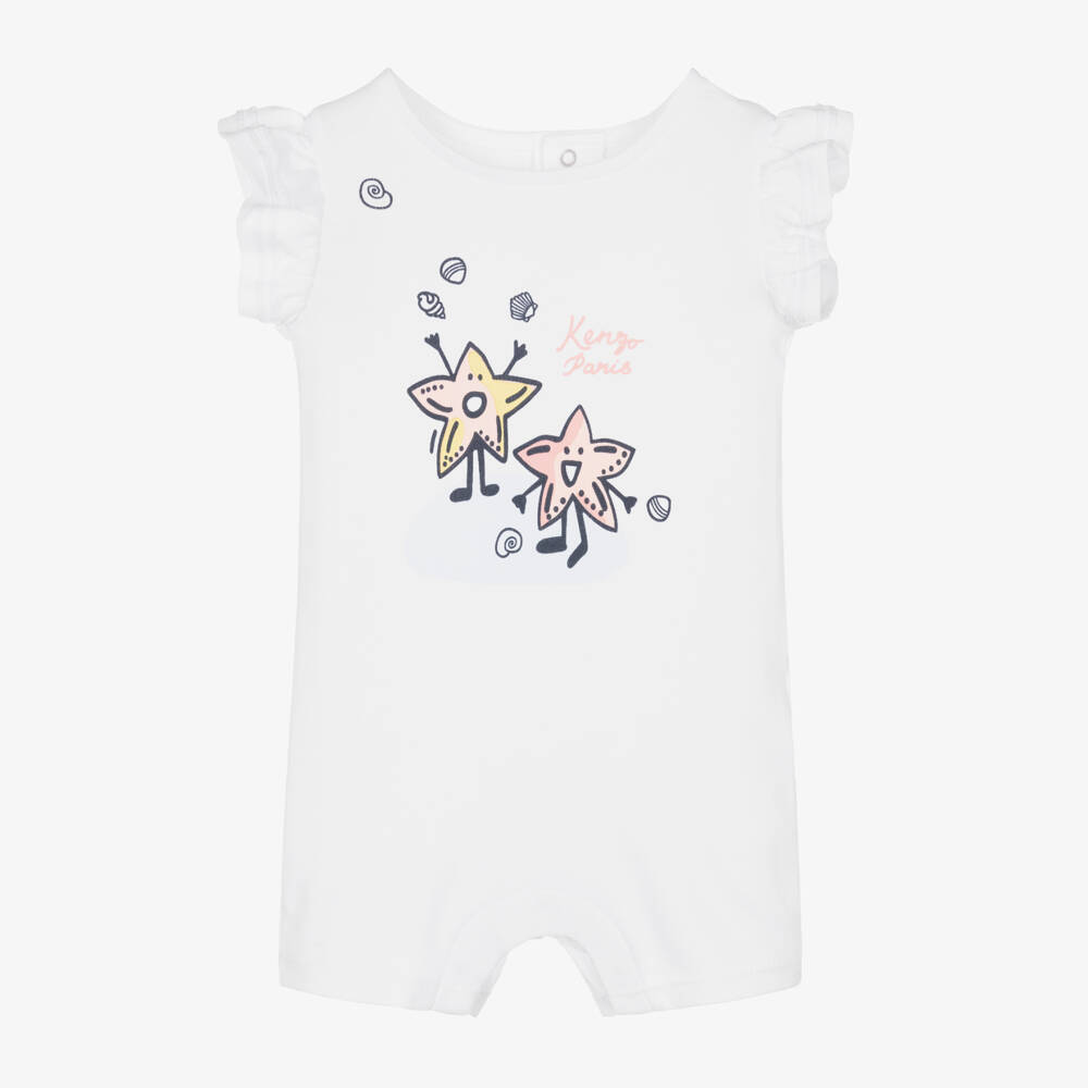 An adorable white shortie for baby girls by KENZO KIDS, made from soft and stretchy organic cotton jersey. With frilled sleeves, this pretty one-piece has cute starfish characters on the front, along with the brand's distinctive logo print. It fastens with poppers on the back and between the legs for quick and easy dressing.
