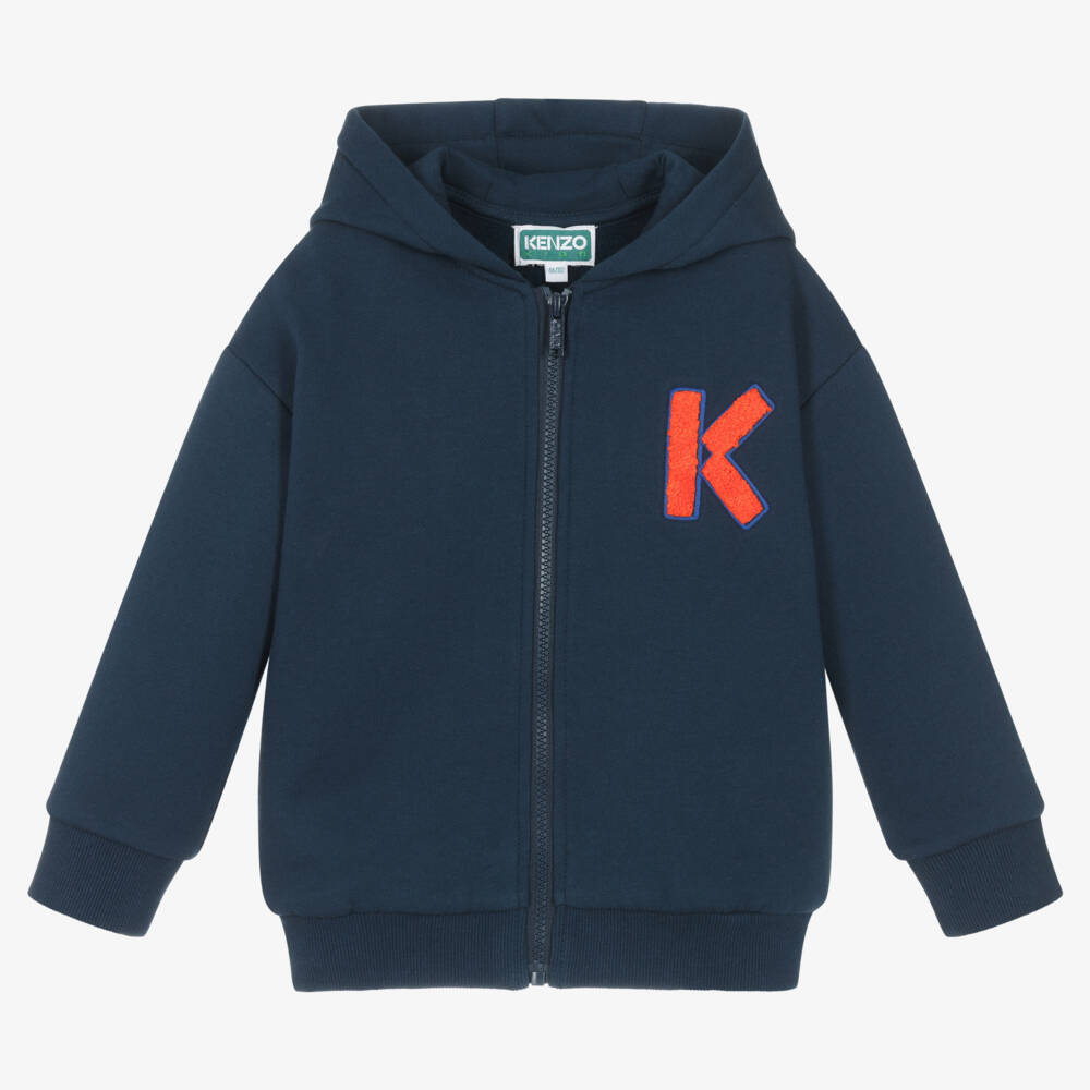 Navy blue zip-up hoodie for boys from KENZO KIDS, made in soft mid-weight cotton jersey. For instant designer recognition, it has a K motif on the front with a bold orange-red Kenzo Paris logo embroidered on the back, with soft bouclé adding texture. Comfortable to wear, it has a fleecy interior, ribbed trims and a branded zip fastening on the front.