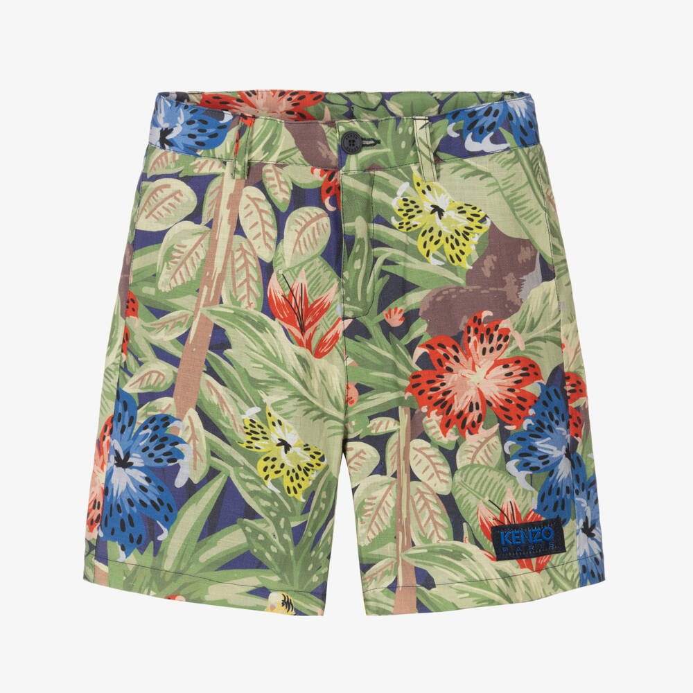 Fun green Bermuda shorts for boys from KENZO KIDS, made in soft linen. They have an eye-catching colourful green house print, and concealed pockets for a neat finish. A zip and button fastening makes for easy dressing and the waist can be adjusted for a better fit.