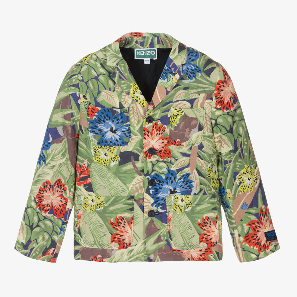 Fun green blazer for boys from KENZO KIDS, made in linen it's soft and lightweight. It has an all-over colourful green house print, and is lined in soft cotton voile for comfort. It fastens with branded buttons and has four pockets, one sleeve has a logo patch for a branded finish.