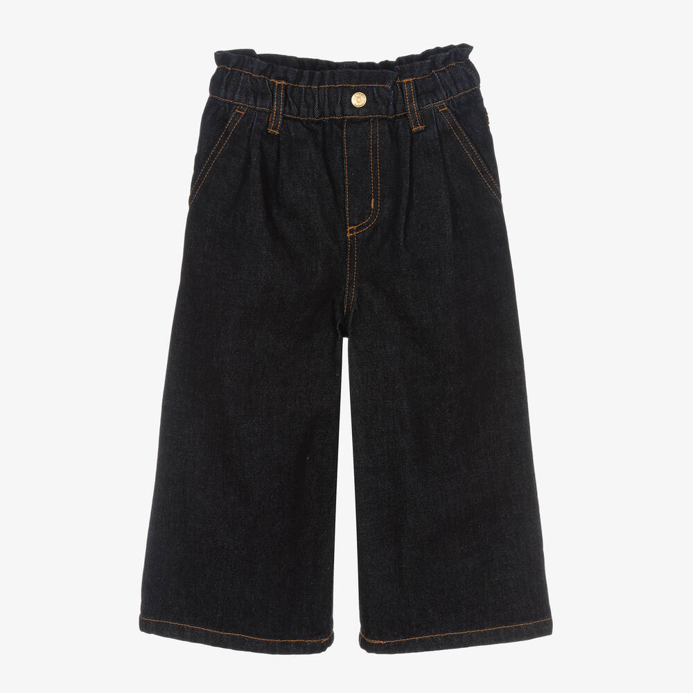 Wide leg jeans for girls by KENZO KIDS, in dark blue cotton denim. They have an elasticated waistband, a decorative gold button and mustard yellow topstitching for an authentic look. Pleats below the waistband give the jeans a more tailored appearance. A cartoon-style tiger and Kenzo Paris embroidery on the back pocket adds distinctive designer detailing.