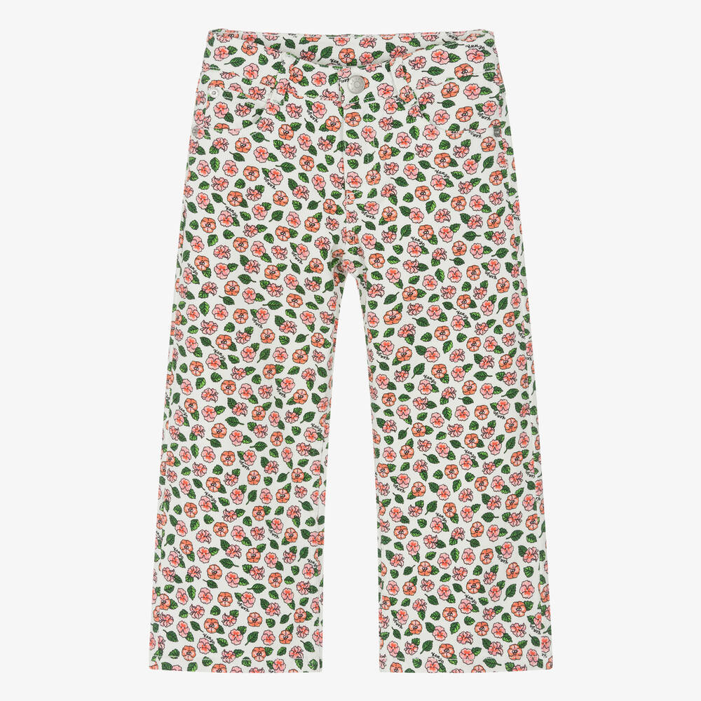 Pretty ivory denim jeans for girls by luxury French fashion house KENZO KIDS, with a pink and green floral pattern incorporating little black logos. Made in mid-weight cotton twill in a wide-leg design, they have classic five-pocket styling and a useful, adjustable waistband for a good fit. There is a silver logo popper fastening and a zip on the front, with coordinating silver logo rivets.