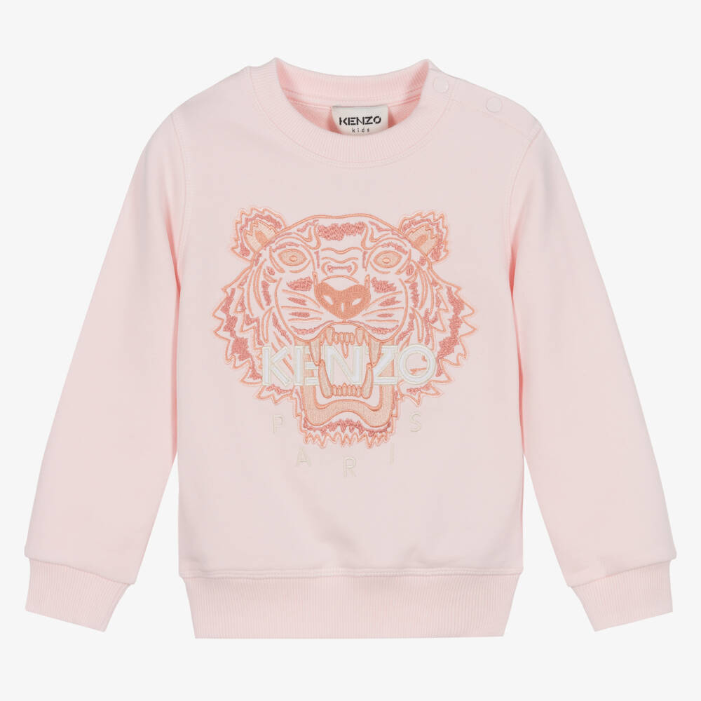 Pale pink sweatshirt for little girls by KENZO KIDS made in soft, mid-weight cotton jersey. It has the brand's iconic Tiger embroidered on the front in shades of pink and a white logo. Comfortable to wear, this casual top has ribbed trims and branded popper fastenings on one shoulder for easy dressing.