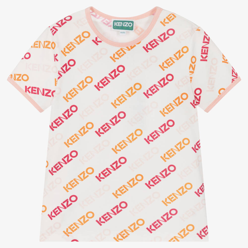 White T-shirt for girls by KENZO KIDS, made in breathable cotton piqué. Sporty with narrow pink trims, it has an all-over pink and orange repeat logo pattern for a signature look.