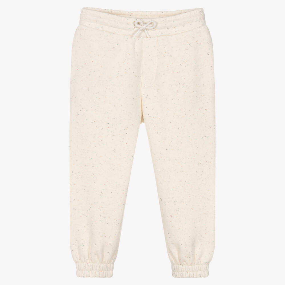 Ivory marl joggers for boys and girls from KENZO KIDS, patterned with colourful flecks. Soft and comfortable, they are made in cotton-blend jersey with a cosy fleece underside and have an elasticated waist with an adjustable drawstring for a great fit. This casual cuffed style has concealed side pockets and the French brand's KOTORA Tiger logo is embroidered on the back patch pocket.