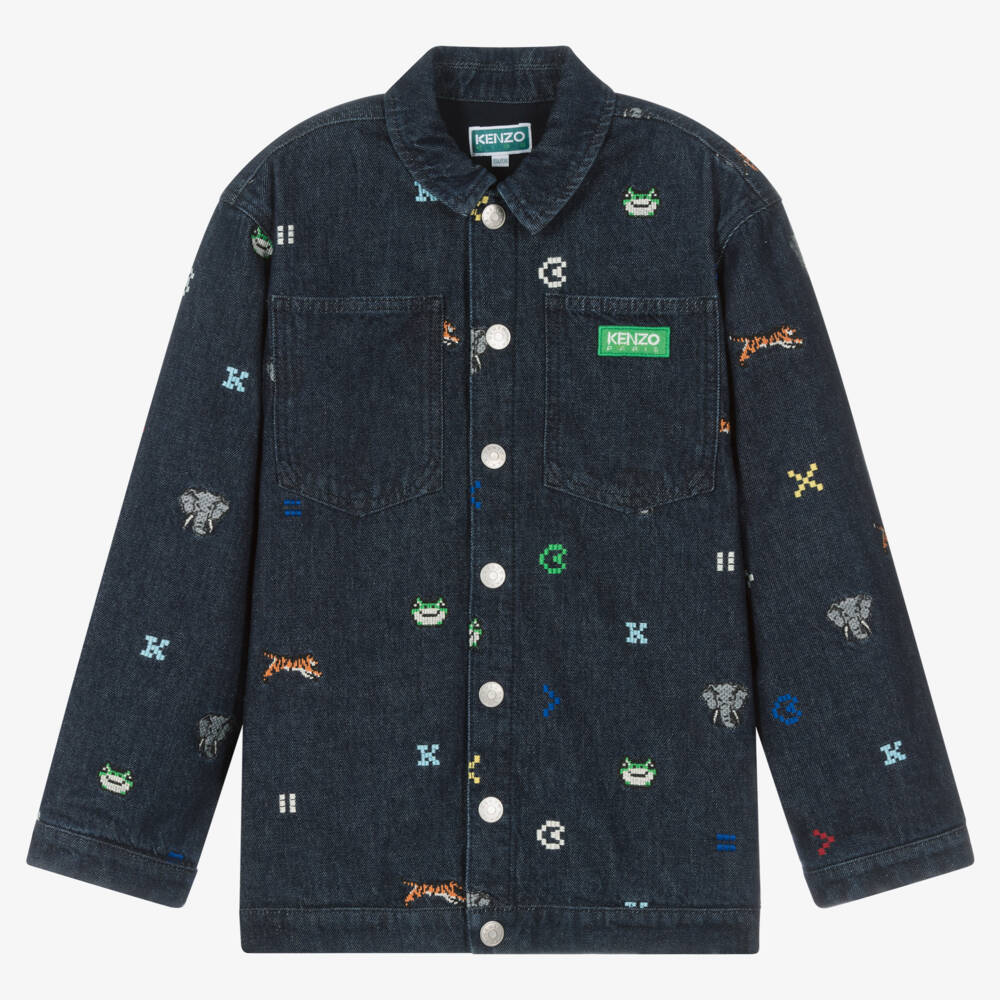 Cool and casual, this dark blue denim jacket for teen boys is by KENZO KIDS. Styled in a relaxed fit, it is embroidered with jungle animals and logo lettering in a colourful pixelated design. It fastens with branded poppers and has a green Kenzo Paris logo badge on one of the chest patch pockets, for extra designer appeal.