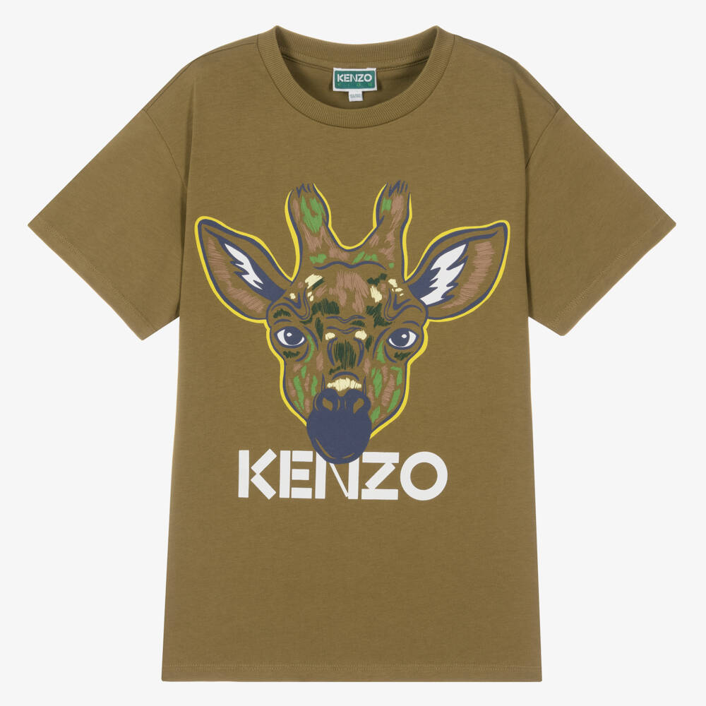 From KENZO KIDS, green T-shirt for teen boys with the iconic Giraffe logo printed on the front. Cool and casual, this organic cotton jersey T-shirt is finished with a large white logo for instant brand recognition.