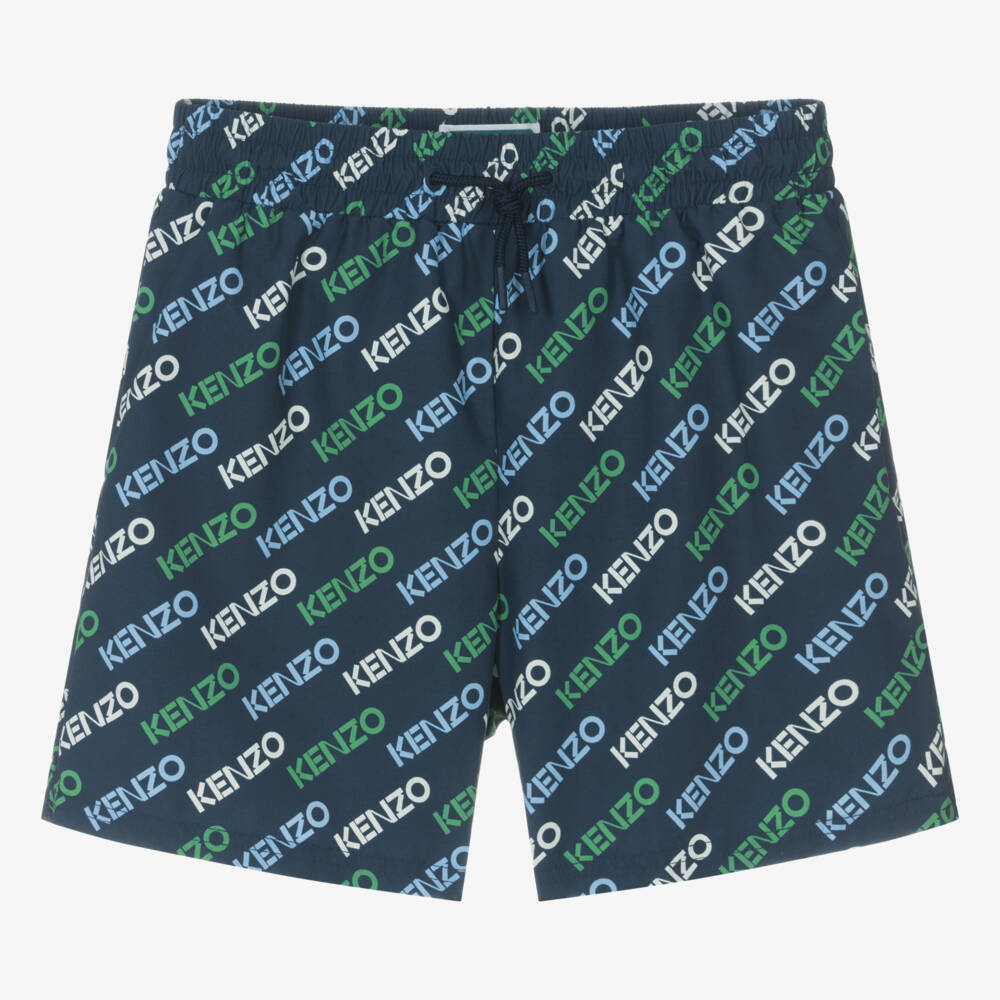 Multicoloured logos stand out on these navy blue KENZO KIDS swim shorts for teen boys. Patterned with white, blue and green lettering, these signature shorts are made in silky smooth fabric with a comfortable mesh lining. Drawstring ties, with branding on the caps, can be easily adjusted on the waist for the right fit.