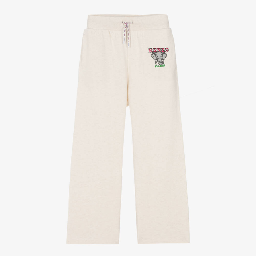 Ivory marl wide-leg joggers for teen girls by KENZO KIDS, with an embroidered, pixelated elephant and logo motif on the front, for a signature look. They have a comfortable elasticated drawstring waist, concealed side seam pockets and are made in soft and cosy cotton sweatshirt jersey.