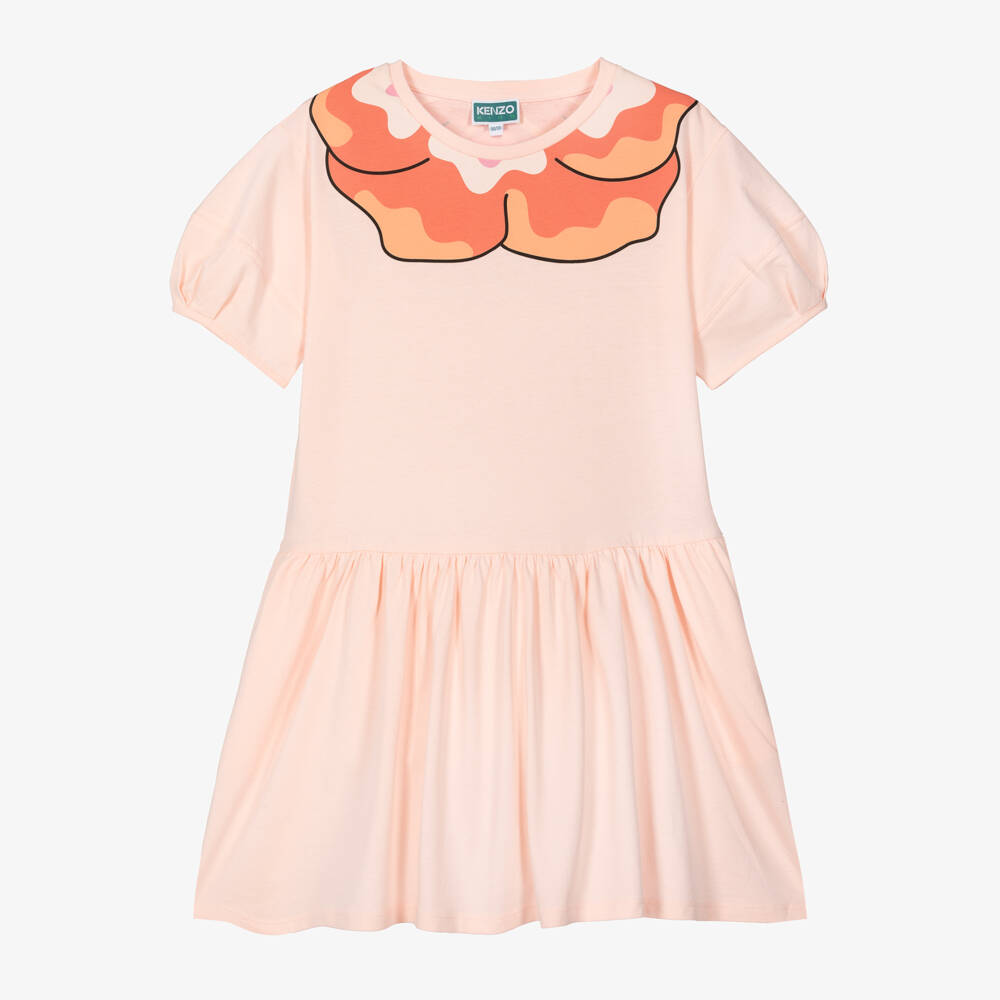 A pink cotton dress for teen girls by KENZO KIDS. Standing out on the back is a cool banner-style logo graphic in black and white. The neckline is designed with pink and orange flower petals and the short sleeves are pleated and gathered to create a girly balloon shape. This comfortable jersey dress has a gathered skirt, dropped shoulders, and hidden pockets on the sides.