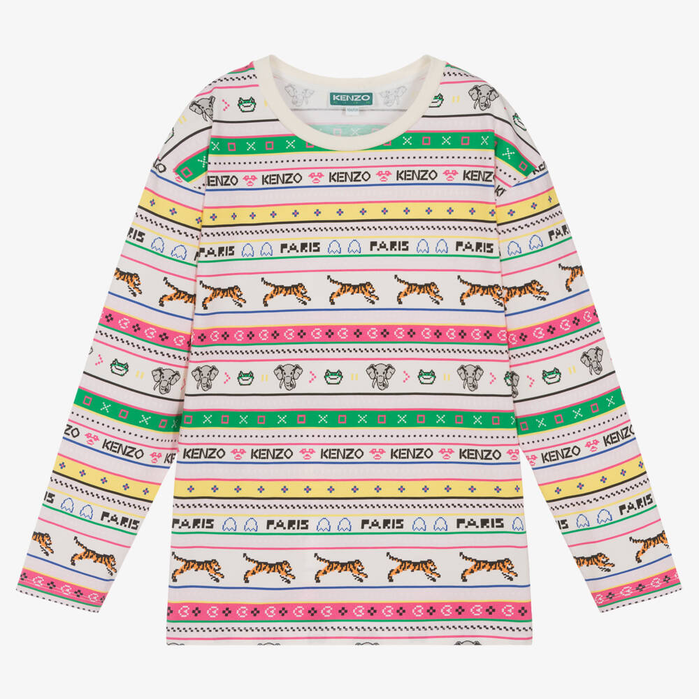 Pink and ivory top for teen girls by KENZO KIDS, patterned in a pixelated jungle animals design. Inspired by 80's video games, the bold pattern incorporates the brand's iconic animals, alongside repeating logos for signature wear. Great for casual styling, it is made in soft and stretchy cotton jersey with a lightly ribbed crew neck.