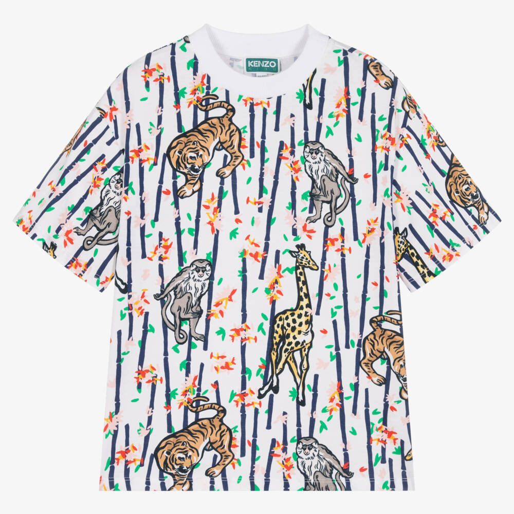 From KENZO KIDS, this teen girls white crew neck T-shirt is made in soft cotton jersey. In quirky Kenzo style, it is patterned in a quirky bamboo jungle print with monkeys, tigers and giraffes. There is also an orange logo print on the back for a subtle designer look.