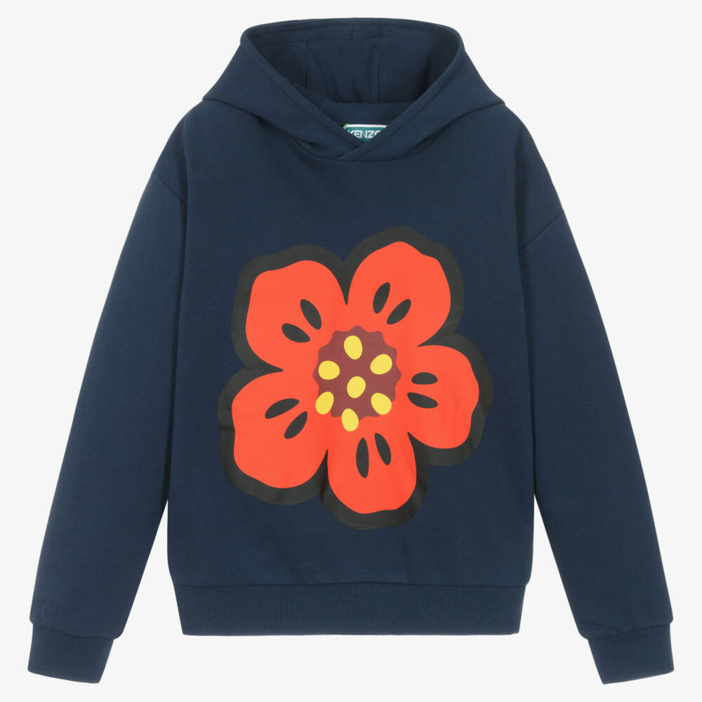 Navy blue hoodie for teen boys and girls from KENZO KIDS, with the brand's signature Boke Flower printed boldly on the front. Great for casual wear, it is made in a comfortable mid-weight cotton jersey with stretchy ribbed trims. A white Kenzo Paris logo print on the back gives a distinctive designer finish.