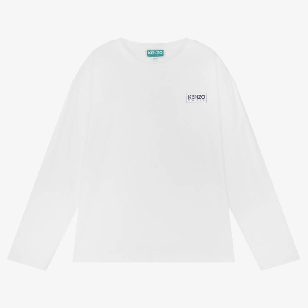 From luxury French brand KENZO KIDS, a white long-sleeved top for teen boys and girls. This casual wardrobe staple is printed with navy blue Kenzo Paris logos on both sides for a simply stylish look and is made in comfortable organic cotton jersey.