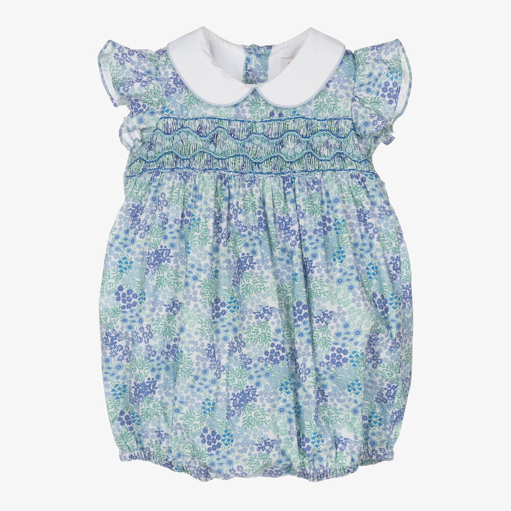 A lovely blue and green shortie for baby girls, handmade in soft cotton by Kidiwi. Patterned with a charming ditsy floral print, this sweet style features traditional hand-smocking, a Peter Pan collar and pretty ruffle sleeves. It fastens neatly with pearlescent buttons on the back and between the legs.