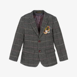 A traditional red, blue and green tartan blazer for boys by Kidiwi, ideal for a smart occasions and the festive season. This single-breasted jacket is handcrafted in soft cotton-blend twill with a notched lapel and navy blue velvet trims to complement the tailored look. It is fully lined in voile for comfort and has two useful flap pockets.