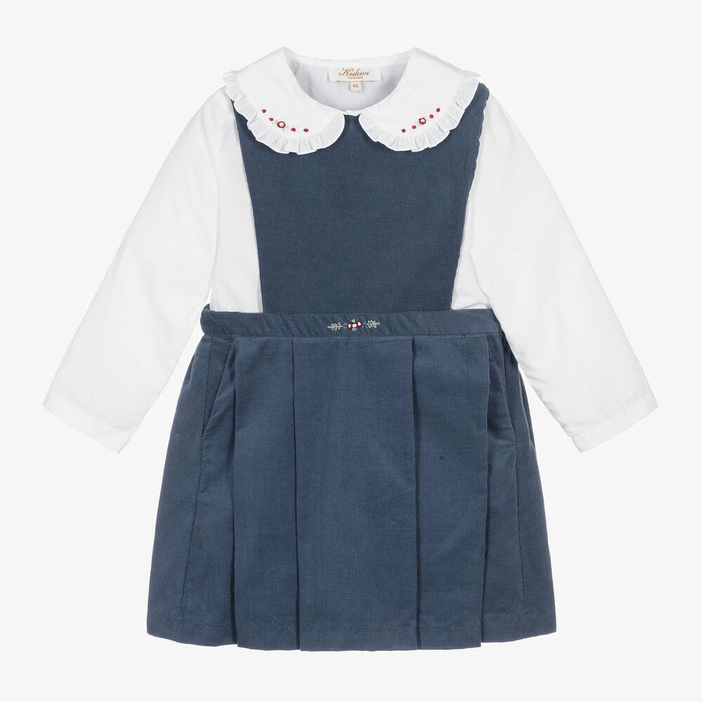 Pretty blue pinafore dress set for girls handmade by Kidiwi. The dress is made in soft cotton corduroy with a pleated skirt and concealed side pockets. Fully lined with lightweight voile for added comfort, the dress fastens with a side zip. The white cotton poplin blouse has a classic Peter Pan collar. Dainty embroidered flowers on the blouse collar and dress waist give a subtle coordinating finish.