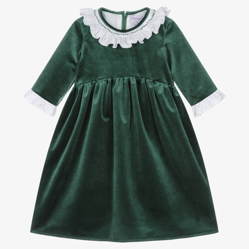 Enchanting green handmade velvet dress for girls by Kidiwi, lined in lightweight cotton voile for comfort. It has a frilled white poplin collar, with beautiful hand-smocked detailing and pretty pink floral embroideries. The elegant three-quarter length sleeves have matching white ruffle trims, and there is a concealed back zip fastening for a neat finish.