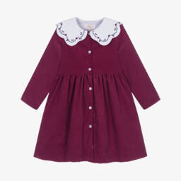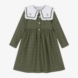 A gorgeous handmade cotton dress for girls by Kidiwi, with a lovely pink, blue and green floral pattern. Traditionally styled, it has beautifully hand-smocked panels and an olive green velvet collar with matching, decorative buttons and trims. There are pretty puffed sleeves and gathers around the waist giving a pretty flared shape. A sash tie on the back provides a smart finishing touch.