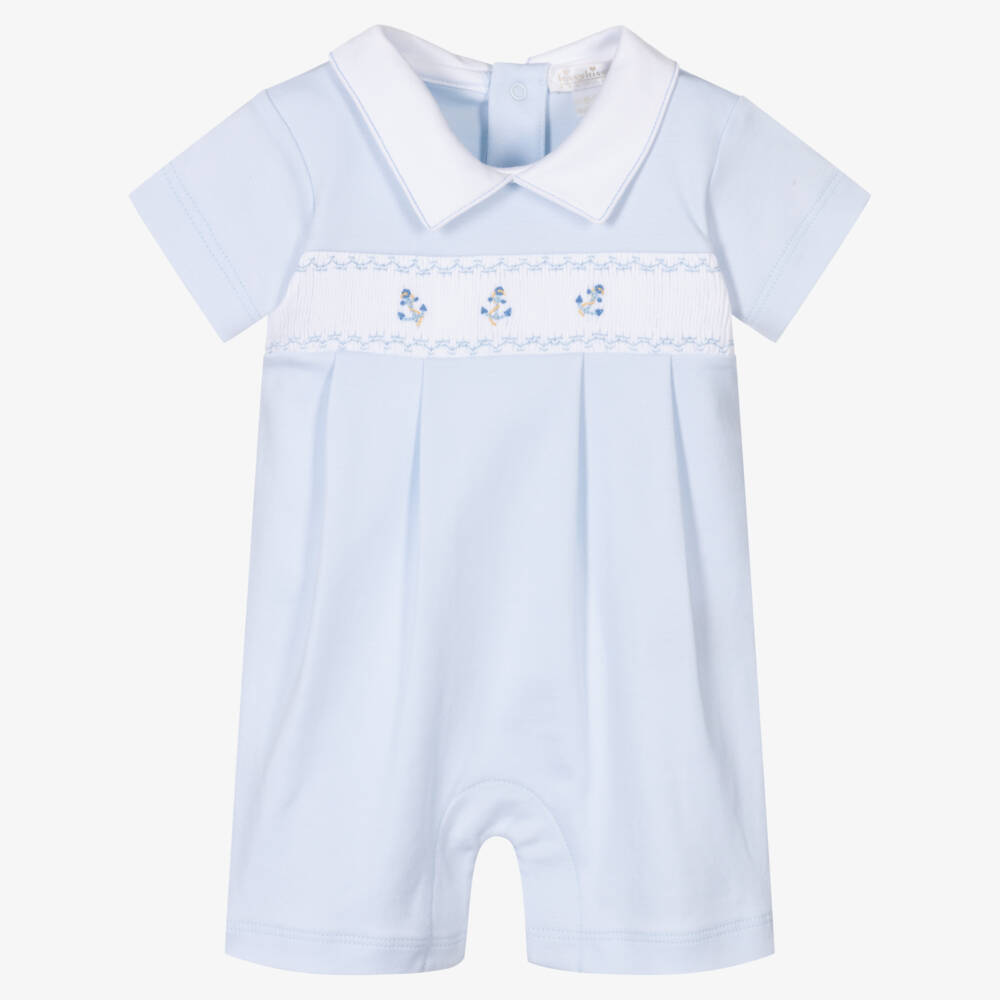 Pale blue shortie for baby boys by Kissy Kissy, made in super soft Pima cotton jersey. It has a white pointed collar, gentle pleats on the front, and easy-fastening poppers on the back and between the legs. There is a beautifully hand-smocked panel across the chest, with sweet little hand-embroidered anchors.