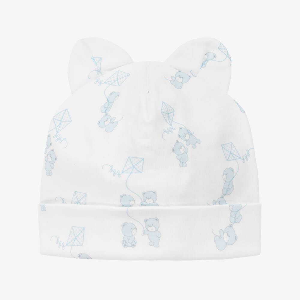 Charming white hat for baby boys from Kissy Kissy. Made in super soft Pima cotton jersey, it is comfortable against delicate skin. It has a blue print of bears flying kites and 3D ears on the top for a sweet finish.