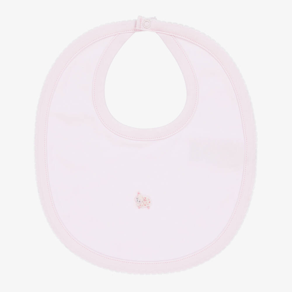 A pink bib for baby girls by Kissy Kissy. Trimmed with picot stitching, it is detailed with an adorable hand-embroidered sheep on the front. This lovely bib is made in a double layer of beautifully soft Pima cotton jersey. It secures with a popper on the back.