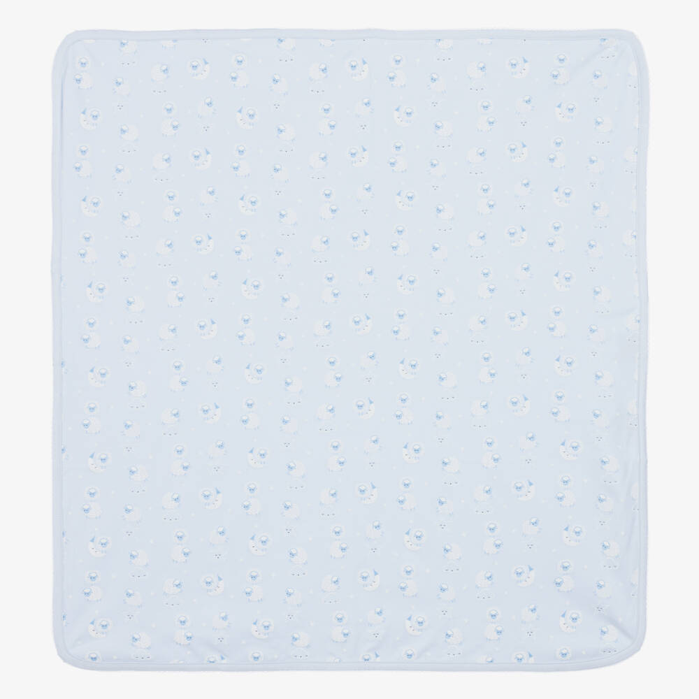 Cute pale blue blanket for baby boys by Kissy Kissy. Made in luxuriously soft Pima cotton jersey, one side has a lovely lamb, moon and stars print and it has an embroidered white picot trim.
