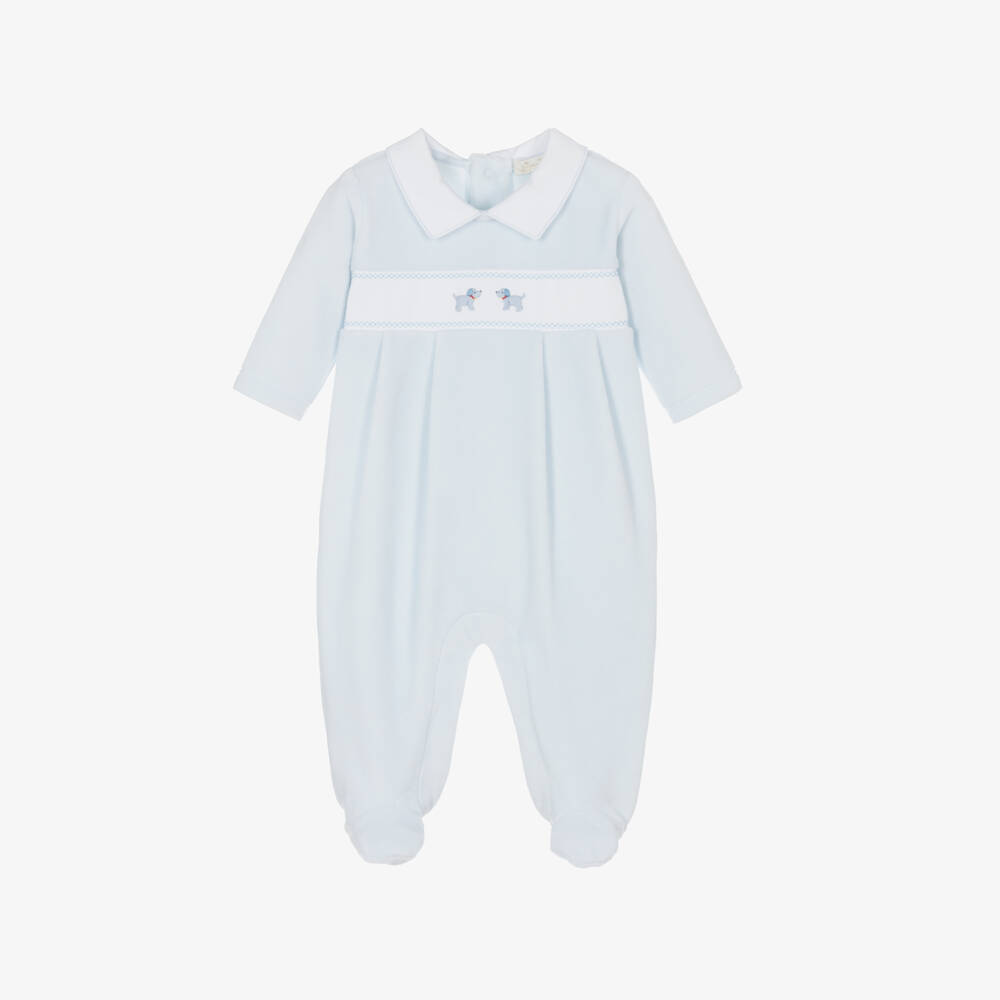 Adorable pale blue babygrow for boys by Kissy Kissy. Cosy for cooler days, it is made from super soft cotton velour with a white pointed jersey collar. It has a white panel across the chest, beautifully hand-embroidered with two cute puppies in blue. It fastens with easy-to-use poppers on the back and between the legs.