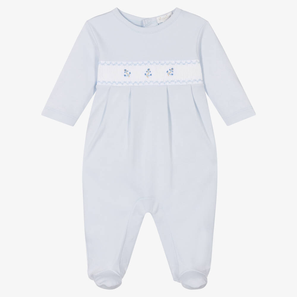 Pale blue babygrow for boys by Kissy Kissy, made in super soft Pima cotton jersey. It has a beautifully hand-smocked panel across the chest, with sweet little embroidered anchors. There are gentle pleats on the front and easy-fastening poppers on the back and between the legs.