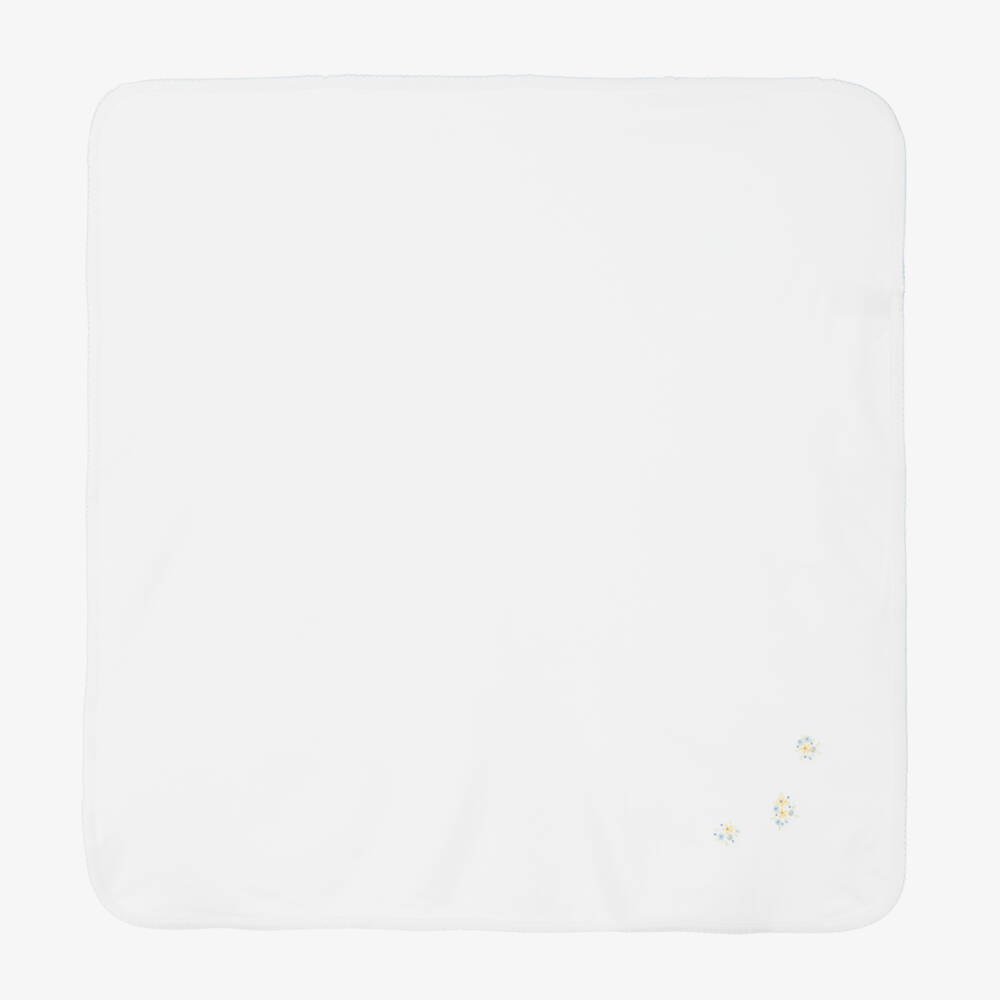 Cute white blanket for baby girls by Kissy Kissy, made in super soft Pima cotton jersey. It has sweet blue picot embroidery trims and delicate flowers in one corner, brightly accented with shades of yellow.