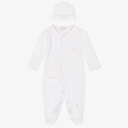 Exclusive to Childrensalon, a white babygrow and hat set for boys and girls by Kissy Kissy, with a sweet grey star pattern and cute embroidered sheep on the front. It is made in super soft, stretchy Pima cotton jersey with popper fastenings on the front and between the legs on the babygrow for easy dressing and changes. Smaller sizes have fold-over scratch mitts for comfort and protection.