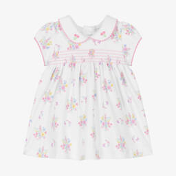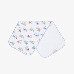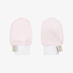 White Pima cotton scratch mittens for baby boys and girls by Kissy Kissy, with a delicate embroidered teddy bear face on each. They are made in beautifully soft jersey with elasticated cuffs for a secure fit on little hands.
