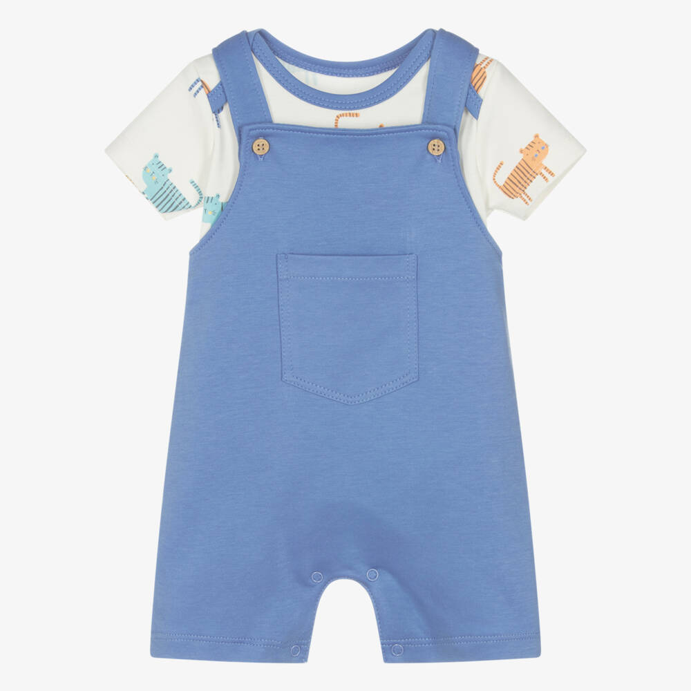 Dungaree shorts set for baby boys from Kissy Love, in ivory and blue. Both items are made from super-soft Pima cotton jersey, known for its gentleness on delicate skin. Patterned with adorable striped tigers, the short-sleeved bodyvest has an envelope neckline and poppers between the legs for ease of dressing. For that classic look, the matching dungaree shorts have wooden button fastenings on the shoulder straps and a patch pocket on the front. Poppers fasten between the legs to help with quick changing.