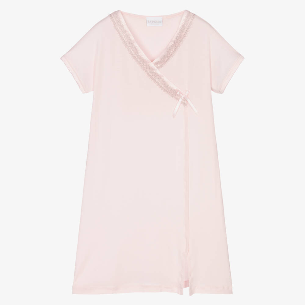 Lovely pale pink nightie for girls by luxury Italian designer La Perla, made with beautifully soft Modal jersey. In a faux wrap-over style, it has a fixed satin trim around the neckline, with pretty silver and white lace and a pink silky bow. There is a logo patch on the back of the neckline, and it is presented in a branded gift box.