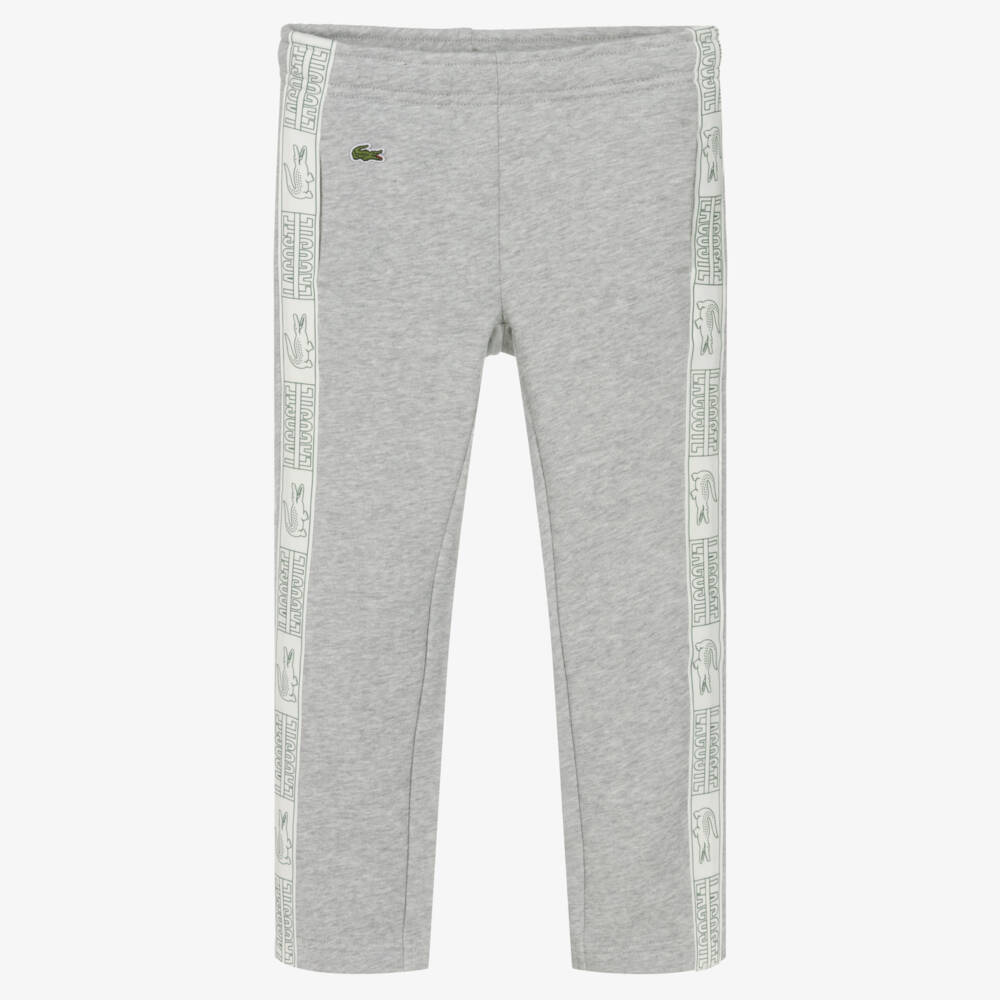 Great for casual styling, these grey cotton jersey joggers for boys are from Lacoste. They have white and green logo taping on the sides, with the brand's iconic crocodile badge on the front. Easy to wear, these straight-fitting joggers have an internal drawstring waist and concealed pockets.