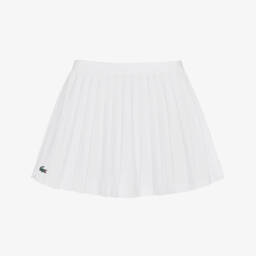 Navy blue skirt for girls by Lacoste, made in silky soft fabric. The skirt has a comfortable drawstring waistband and a pleated silhouette for comfort and movement. The green Crocodile logo on the front adds recognisable designer detail.
