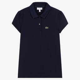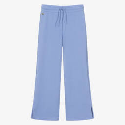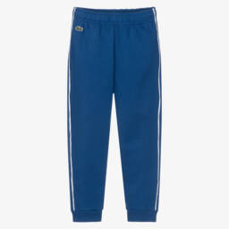 Navy blue joggers for teen boys by French brand Lacoste, with the iconic green crocodile logo appliqué on the front. There are side seam pockets and an elasticated waistband with an internal drawstring for a comfortable fit. Warm and cosy, they have a fleecy inside and ribbed cuffs and are made in soft, mid-weight organic cotton blend jersey.