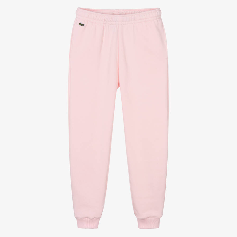 Light pink joggers for teen girls by Lacoste, with the French brand's iconic crocodile patch on the hip. Made in a soft jersey blend of organic cotton and recycled fibres, they have a cosy fleece feel inside. The comfortable elasticated waist has an internal drawstring tie for an adjustable fit and there are useful side seam pockets.