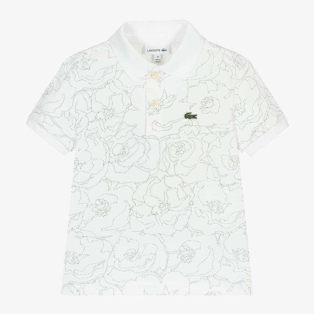 White polo shirt for boys and girls by Lacoste, made in the brand's signature organic cotton petit piqué fabric. Classically styled with a ribbed collar and button fastenings on the front, it is patterned with an abstract green floral design. This lightweight, casual top features the iconic embroidered crocodile logo on the chest for a sublte designer finish.