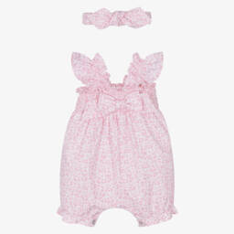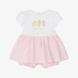 A sweet white shortie for baby girls by Lapin House, made in soft cotton jersey for a comfortable feel. Designed to look like a dress, the woven overlay is designed in pretty broderie anglaise with embroidered eyelets. Ribbon bows, stitched on each shoulder, are printed with pastel-coloured flowers for added charm.